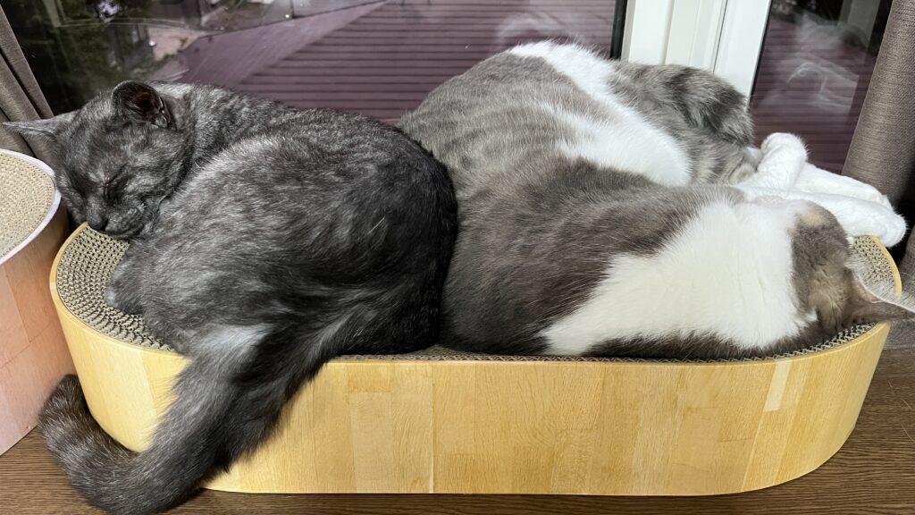 普通のバリバリボウルよりも爪とぎがしやすい形状なので、猫たちにとっては、ベッドというより爪とぎという認識なのかも。